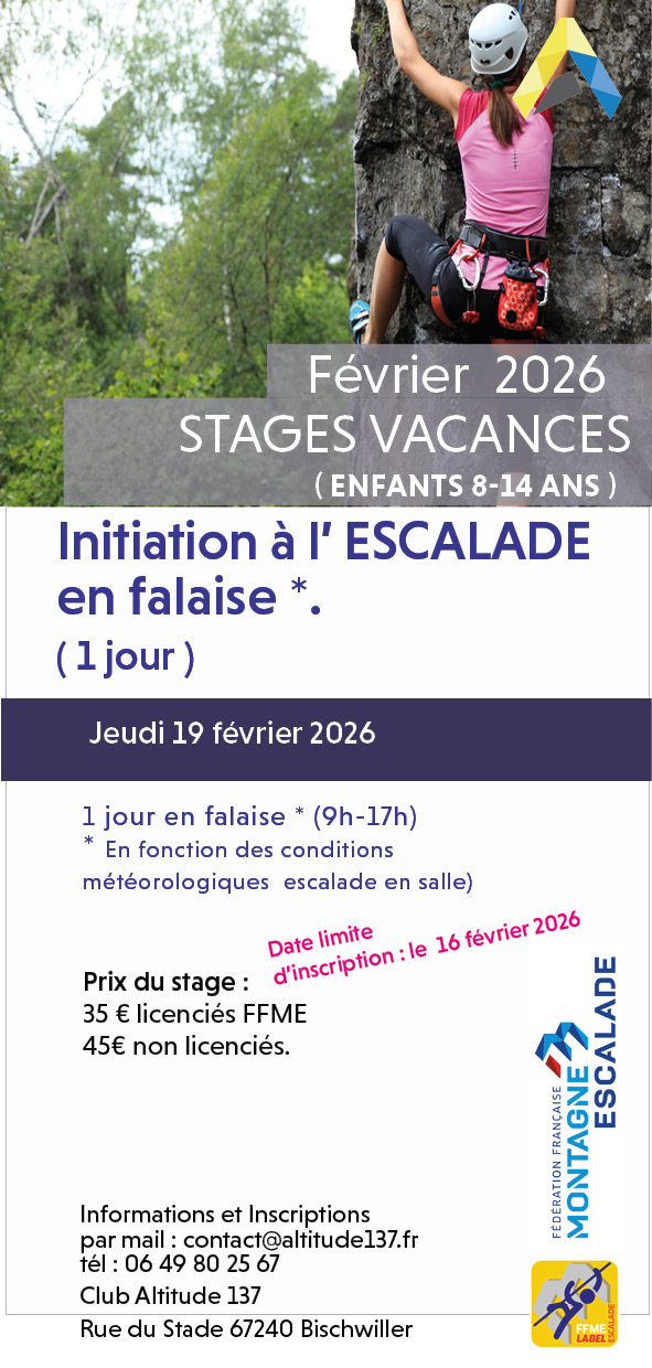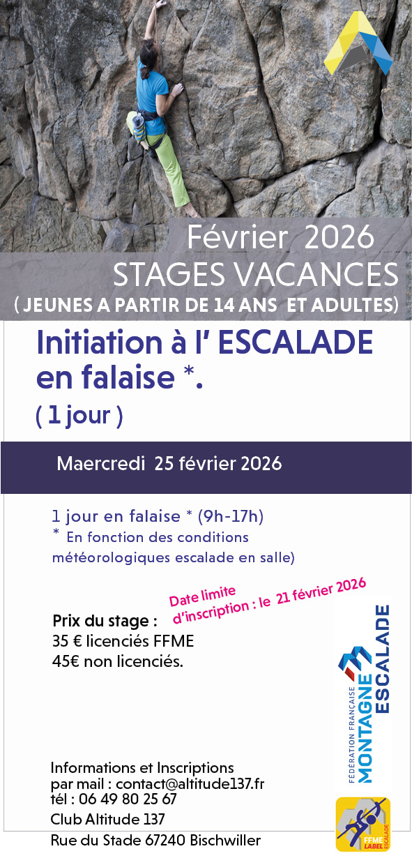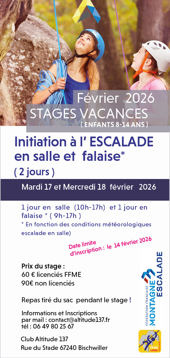 Stages vacances Février 2026 Contact pour tous les stages : Fernando / mail contact@altitude137.fr / tél : 0649802567 Octobre 2025 Lien d’inscription Lien d’inscription Lien d’inscription Lien d’inscription